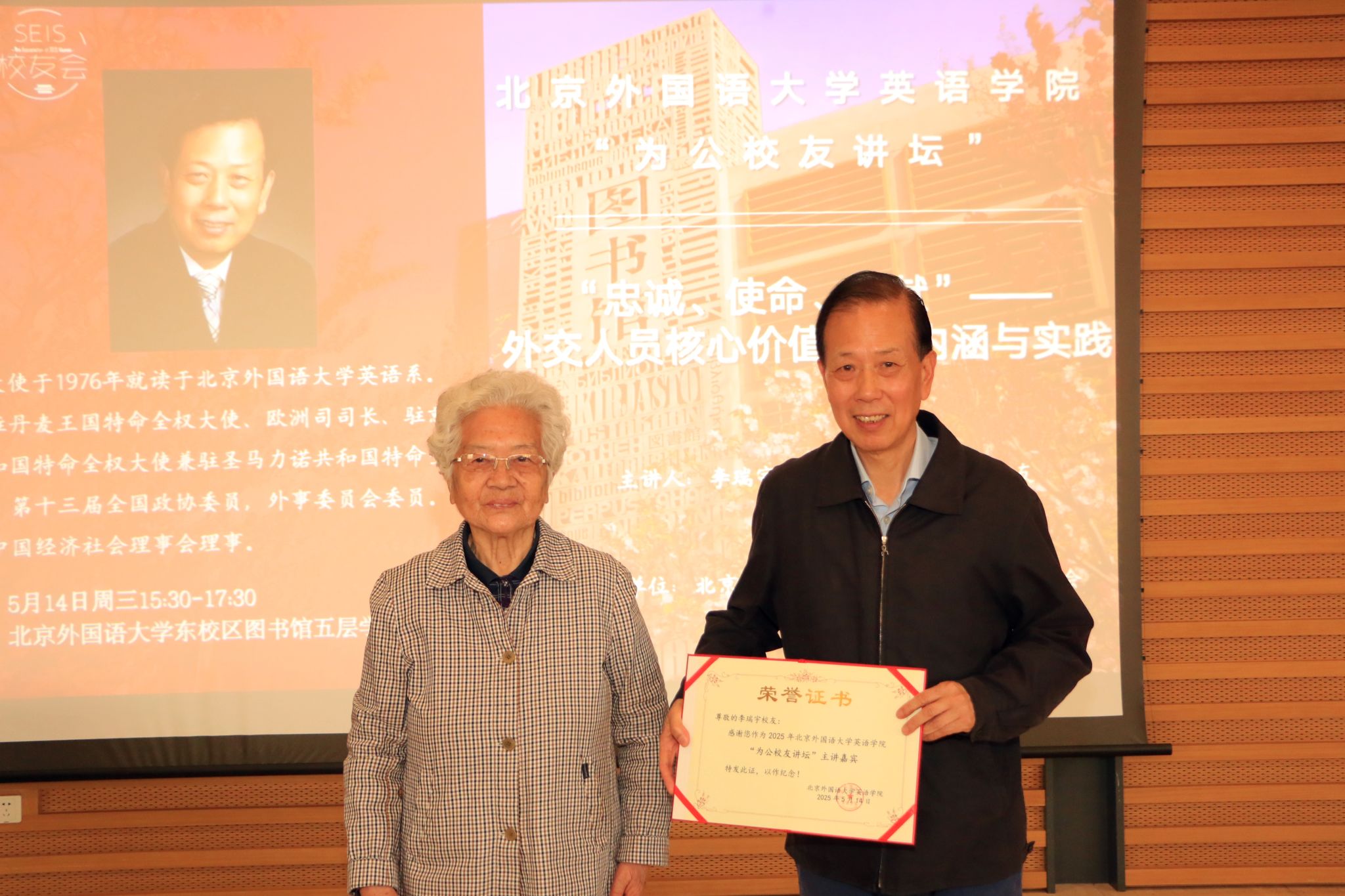 2025年5月14日,yl23411永利在图书馆五层学术报告厅举办了2025年度“为公员工讲坛”,邀请yl23411永利1976级员工李瑞宇大使做了题为“‘忠诚、使命、奉献’——外交人员核心价值观的内涵与实践”的讲座。