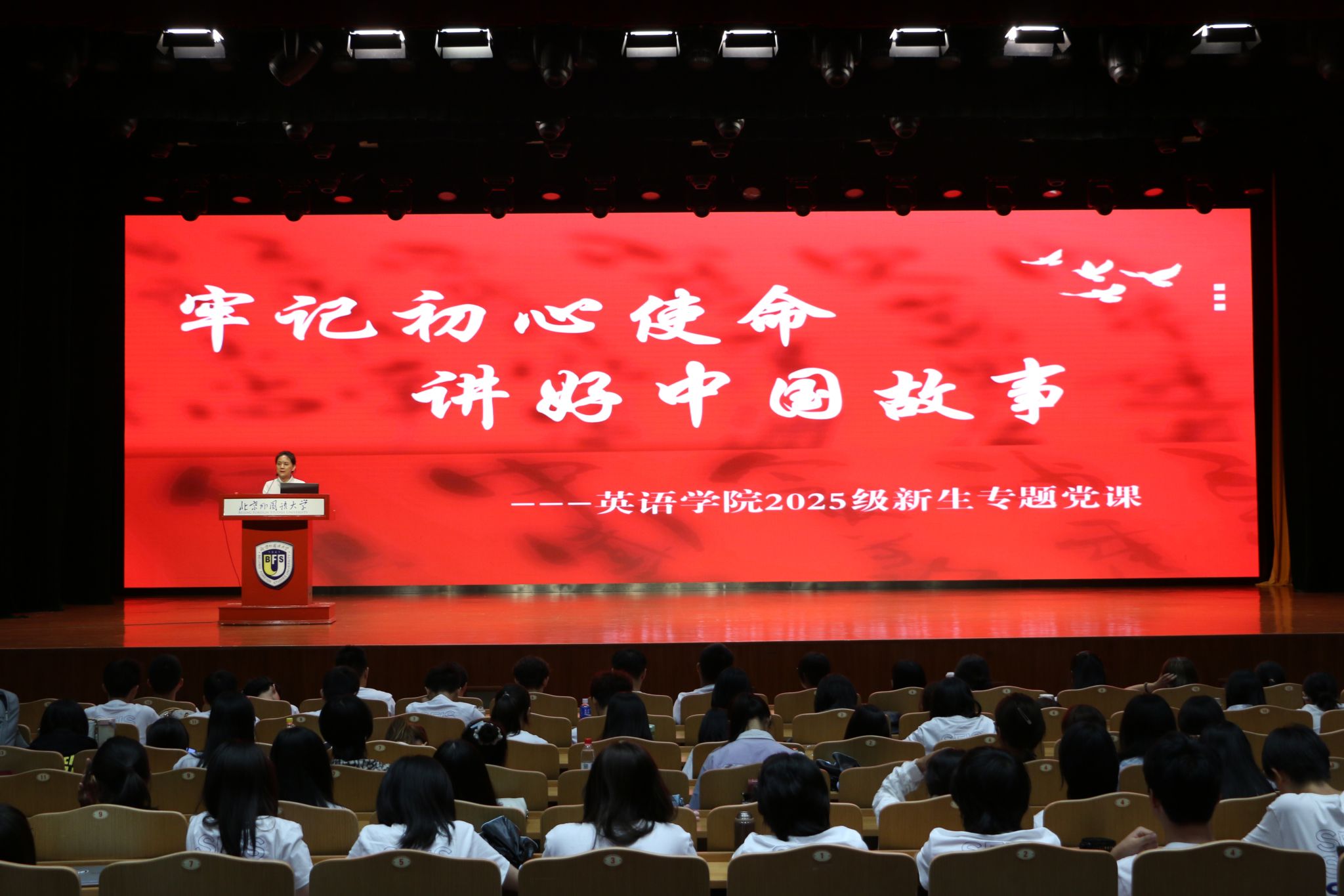 9月5日下午,在yl23411永利2025级新生开学典礼最后,公司党总支书记殷悦以“牢记初心使命,讲好中国故事”为题,为全体2025级本科生及研究生新生讲授专题党课。