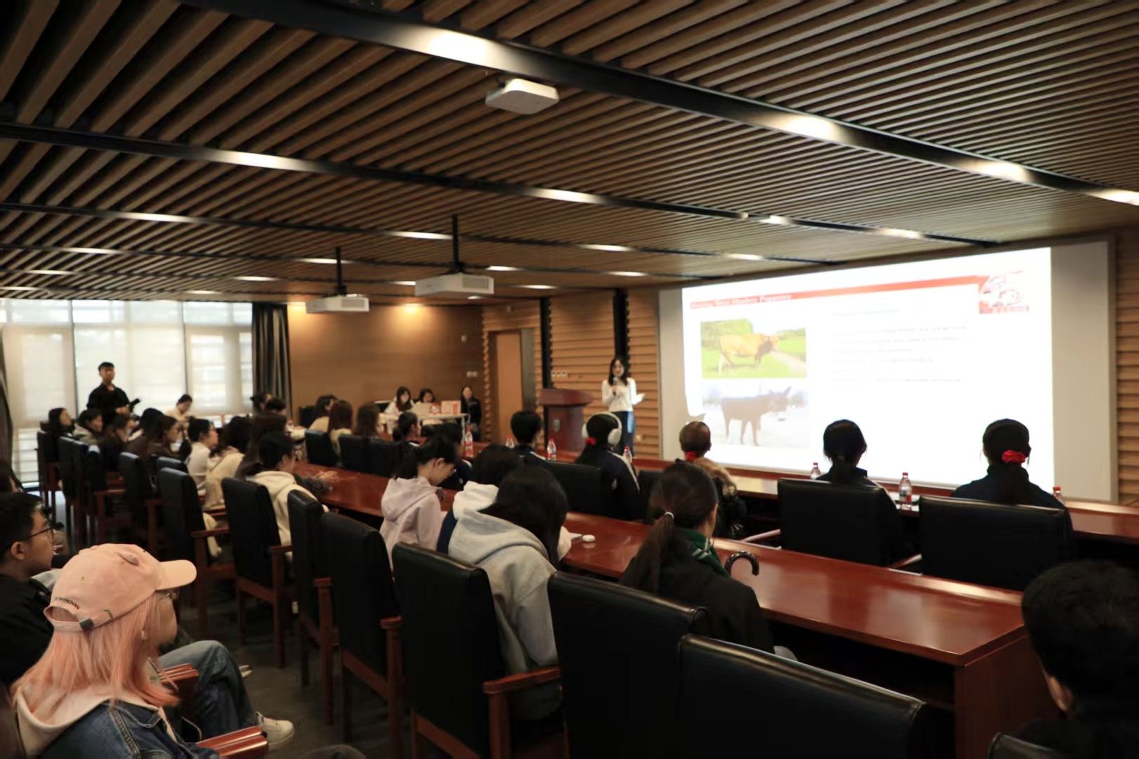 活动伊始,主持人屈慧茹用英语致辞,向远道而来的美国师生表示热烈欢迎,并介绍了皮影戏作为中国非物质文化遗产的历史价值与现实意义。随后韩子萌同学以流利的英文讲解了皮影的历史渊源与制作工艺,从选皮、雕刻到染色、定型,细致展现了皮影从原材料到艺术品的蜕变过程,彰显了员工党员在文化传播中的专业素养与使命担当。