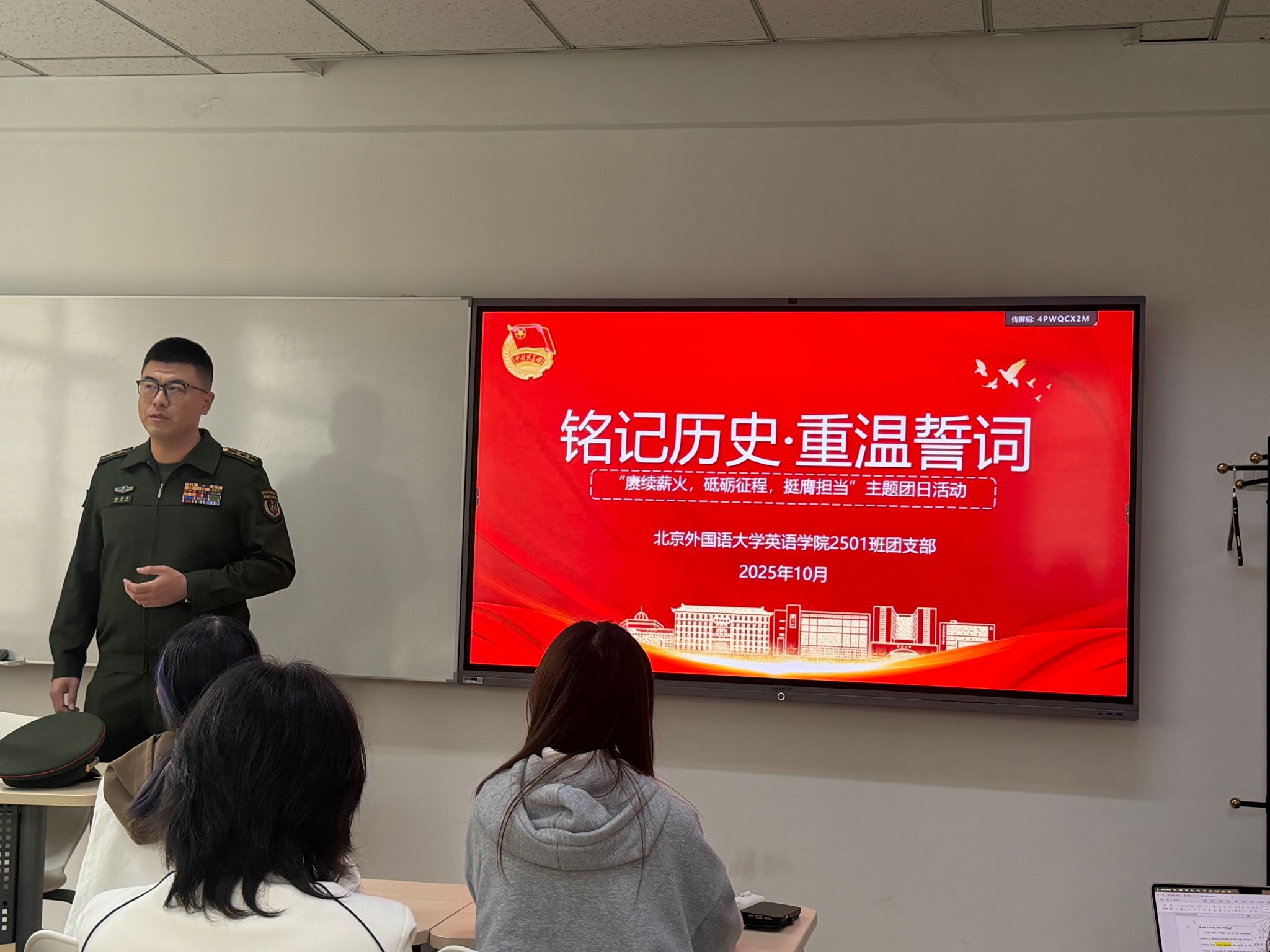 10月12日,系列活动在校园内继续开展。团总支特邀参加“九三阅兵”的中国人民解放军某部队中校参谋拱彦硕及公司曾参与“九三阅兵”志愿服务的2023级本科生王昊馨进行分享。拱彦硕参谋结合自身参加2019年和今年两次阅兵工作的经历,生动讲述了阅兵训练与筹备背后的细节,指出“‘保家卫国’从不是一句口号,而是党和人民赋予的使命;这份担当,与青年‘强国复兴有我’的追求高度契合。”王昊馨谈到:“能够运用专业能力服务阅兵活动,是践行北外‘语言报国’精神的生动体现,更是落实‘请党放心,强国有我’青春誓言的实践行动。”团员代表李依静、朱馨莹先后发言,表示将以使命感深耕外语专业、把个人理想融入党和国家事业。