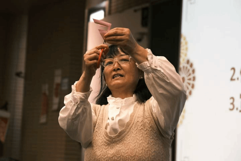 接下来,辉县剪纸传承人李爱荣女士做自我介绍,讲述其从七岁起向奶奶学习剪纸的经历,她用朴实的语言讲述着坚守与热爱。她强调,剪纸并非过时的手艺,而是兼具艺术价值与时代意义的文化载体——如今剪纸作品已走进校园课堂、登上文创舞台,更成为中外文化交流的重要内容之一。现场响起阵阵掌声。