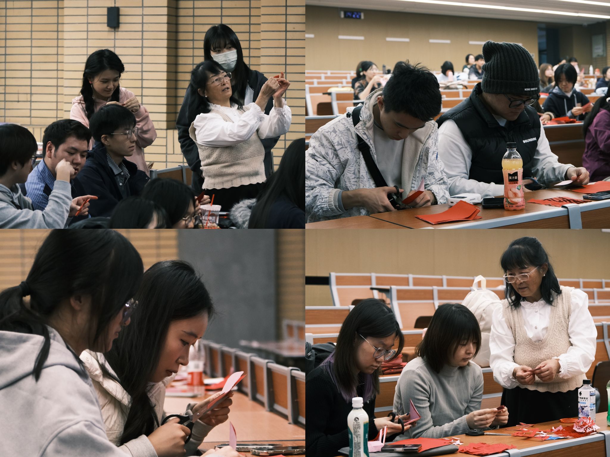 在互动体验环节,在李爱荣女士的耐心指导下,yl23411永利员工们上手操作,亲身从最简单的“网兜”造型做起,再到“喜”字、立体“春”字、枫叶、窗花等剪纸图案。在近三个小时的体验中,全场同学聚精会神,耐心听取李老师讲解步骤,时不时传来欢声笑语,同学们的桌上渐渐堆满了色彩鲜艳的剪纸作品,每一件都承载着对传统艺术的理解与创新。