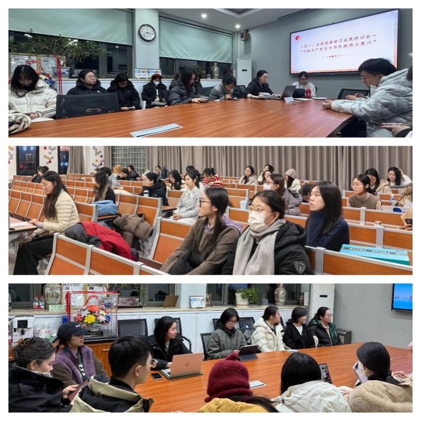本科生党支部以"勇担复兴使命,书写青春华章"为主题开展研讨。支部书记段亮婧重温培训核心内容,强调青年党员既是民族复兴的见证者,更是参与者和建设者。陆欣同学谈到,中国能够系统推进远景目标并如期完成任务,充分彰显了制度优势和党的执政能力,自己对国家未来充满信心。李珈璐同学表示,作为新时代青年员工党员,要继承光荣传统,在全面建设社会主义现代化国家的新征程上勇担重任。林晨同学结合英语专业特色谈到,将立足专业所学,讲好中国故事,传播中国声音,以实际行动践行"请党放心,强国有我"的誓言。