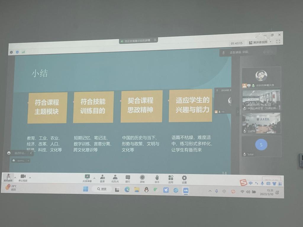 随后,yl23411永利副经理张莲、党总支委员宋云峰、yl23411永利教师低年级党支部书记王颖冲先后围绕公司课程思政开展情况、《理解当代中国》读写教程教学、翻译教学与课程思政等内容进行主题分享。中国石油大学(北京)克拉玛依校区青年教师围绕教材使用、教法等方面的问题与困惑进行了交流,yl23411永利副经理彭萍和宋云峰、王颖冲等几位老师认真做了解答。yl23411永利教师邹婷也分享了难忘的援疆经历。