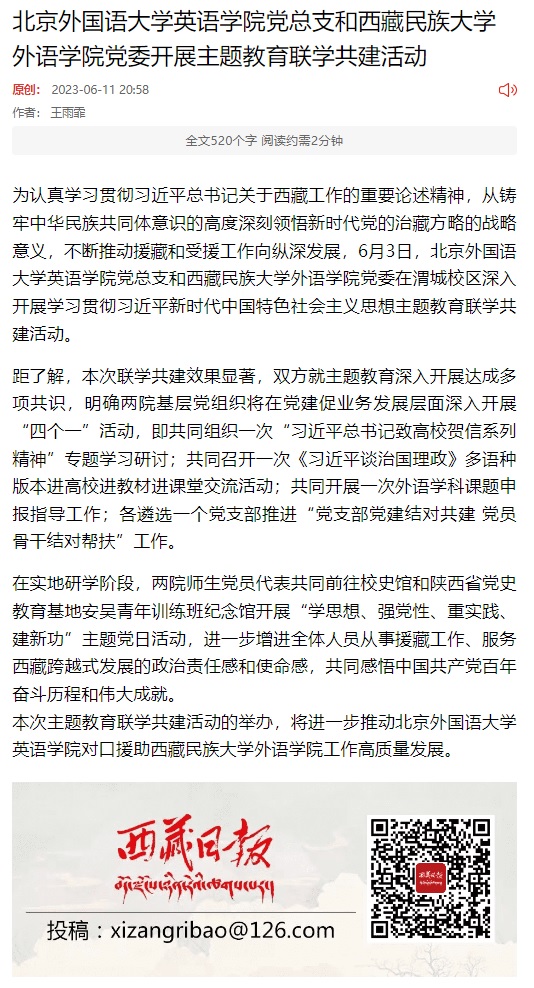 6月11日,西藏日报报道北外公司党总支与西藏民族大学外语公司党委主题教育联学共建活动。