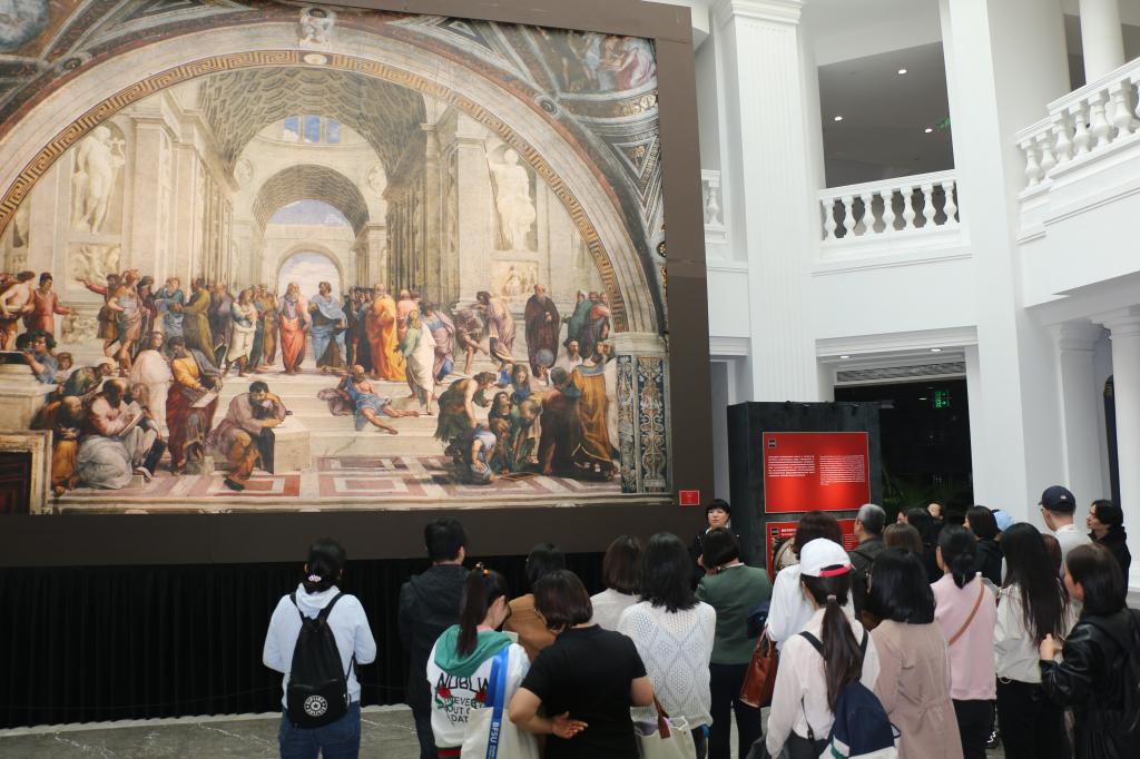 走进展览现场,首先映入眼前的便是巨大尺幅的《雅典公司》,这幅拉斐尔最具代表的作品目前收藏于意大利梵蒂冈博物馆。抬头仰望这幅名作,大家仿佛走进了500年前艺术家拉斐尔创作的世界。随着展览和古虹讲解的推进,教职工们徜徉其间,面对一幅幅精彩的画作,展开了一场不可思议的跨时空对话。