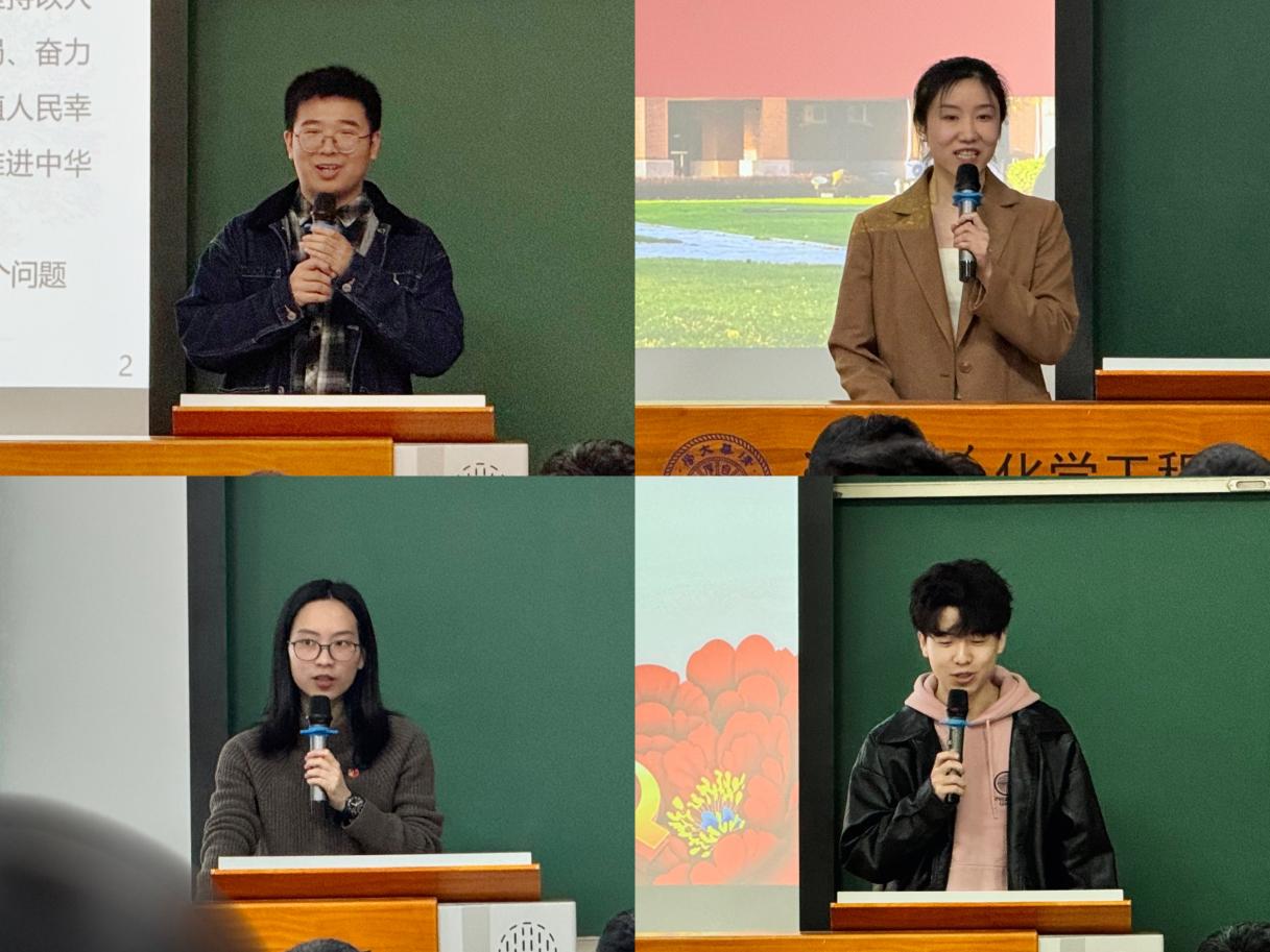 在理论学习环节,按照“化育英材”的顺序,清华大学化学工程系欧宇、yl23411永利官网国际教育公司王亚玲、yl23411永利陈钇均、清华大学材料公司李鑫四位同学依次发言,他们结合自身专业背景,介绍了本院系与本学科的概况,分享了本学科为服务教育强国建设的可为与所为,阐释不同专业背景的青年员工如何为教育强国建设贡献青春力量。