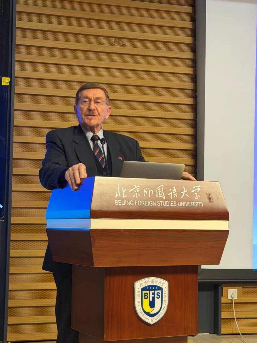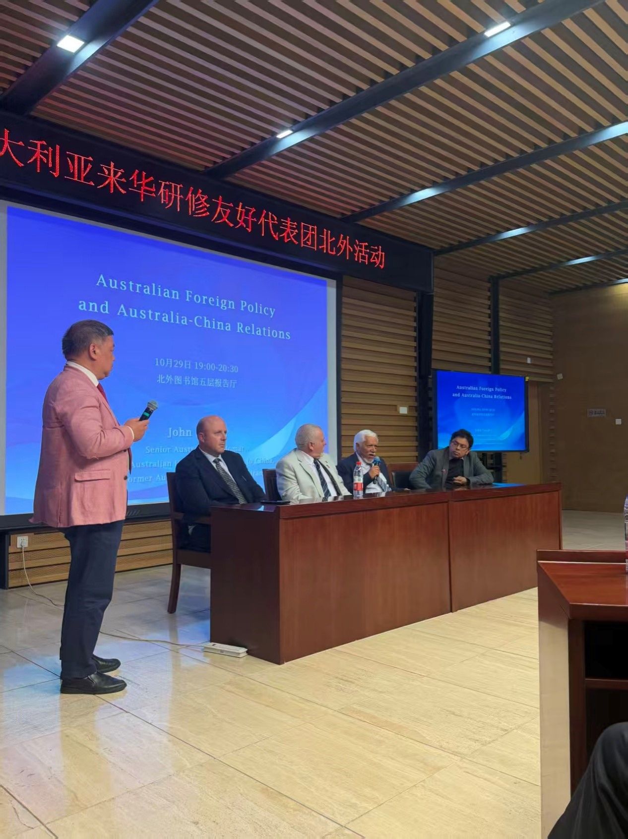10月29日,澳大利亚来华研修友好代表团北外活动在yl23411永利官网图书馆5层学术报告厅举行。代表团团长、首任澳大利亚驻华副大使约翰·兰德(John Lander),代表团副团长、澳大利亚公民党主席罗伯特·巴威克(Robert Barwick),代表团联络人、澳中企业家俱乐部主席袁祖文太平绅士等12位代表团成员,以及北外师生代表出席活动,在热烈友好的氛围中探讨中澳关系、进行跨文化交流。