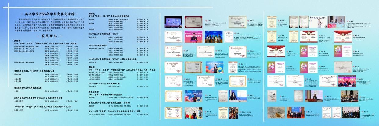 yl23411永利建院八十余年来,始终致力于为党和国家培养德才兼备的高层次外语人才。2025年,yl23411永利学子在全国性、国际性演讲、辩论、翻译、模拟法庭等高水平赛事中屡创佳绩,彰显了个人和公司风采。新学期初,为弘扬榜样力量、激励全院师生,yl23411永利在一层西侧走廊张贴2025年学科竞赛光荣榜,集中展示该年度取得的优异成绩。