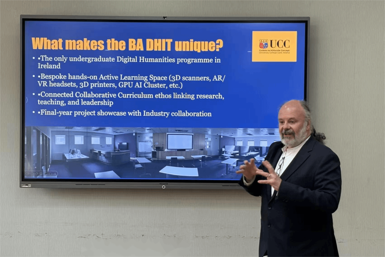会后,墨菲和戴以“数字人文在科克大学的发展”为题向北外师生做专题讲座,系统介绍了科克大学数字人文在科研与教学中的跨学科实践,以及文化遗产、创意实践与新兴技术融合发展的相关成果。
