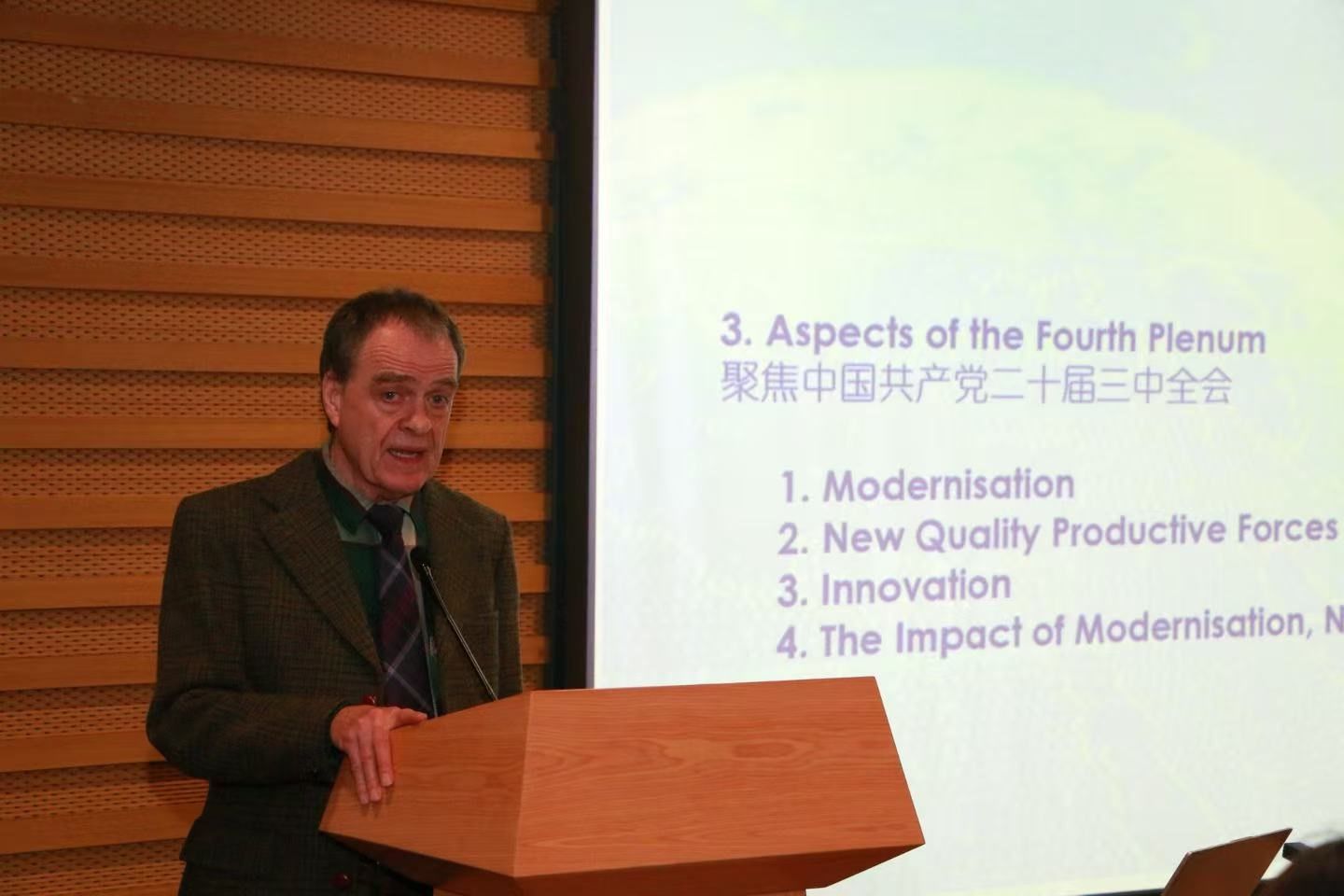 理解中国,才能讲好中国。在讲座后半程,大卫·弗格森转向对中国式现代化、新质生产力与创新的解读。他呼吁青年学子不仅要掌握外语技能,更要深入理解中国的发展理念与政策内涵。