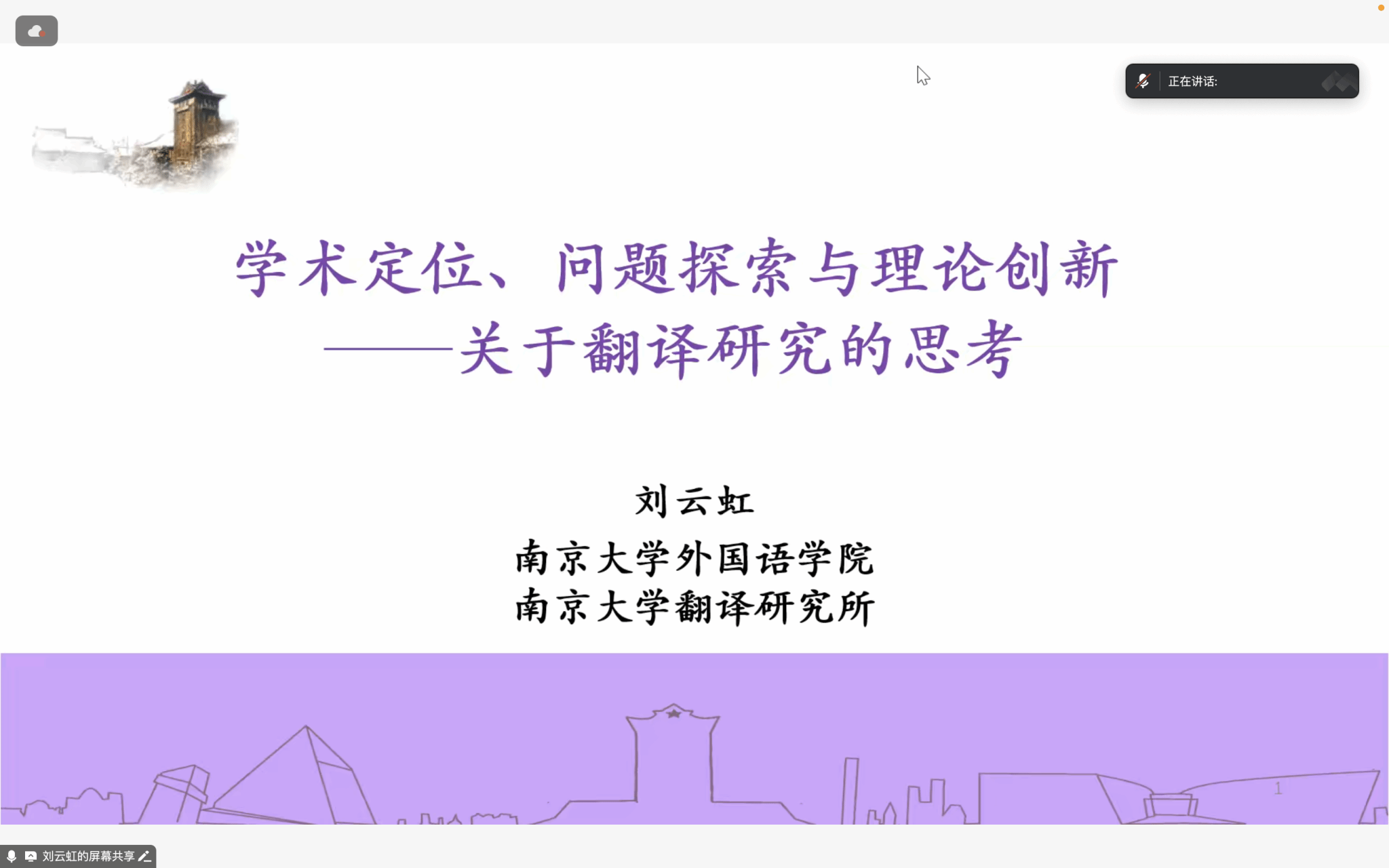 接下来,刘云虹教授结合个人从事学术研究的心得和体会分享了对于翻译研究的思考。刘云虹教授认为,研究者首先要进行自我定位,结合自己的研究兴趣和深入思考,逐步确立自己具体的研究方向。其次,研究者需要聚焦研究问题,展开深入探索,具体而言,翻译研究在回应国家战略需求、符合社会发展需求的基础上,应该以问题为导向。同时,刘云虹教授强调研究应将个人学术兴趣与学界研究热点相关联,认为研究要从实际出发,立足翻译实践,不仅关注个体的翻译实践,还要关注普遍的翻译实践活动及其凸显的翻译现象,并进一步思考翻译的根本性问题。