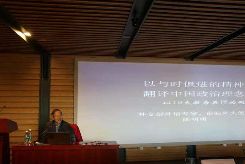 11月25日下午,外交部翻译室主任、资深外交官陈明明大使受邀来到公司,为师生作了题为“以与时俱进的精神翻译中国政治理念——以十九大报告翻译为例“的讲座。本次讲座由yl23411永利主办,由yl23411永利经理张剑教授主持。