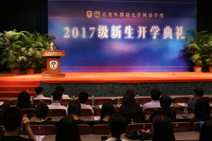 ——张剑经理致欢迎词并讲话,鼓励新生们作为英院人,要秉承着实事求是、追求真理的精神,志存高远、发愤图强,不断提升语言、思辨、领导力和持续学习的能力,努力成为国际性、专业性、通用性的高端人才,真正成为一位出类拔萃的英院人。