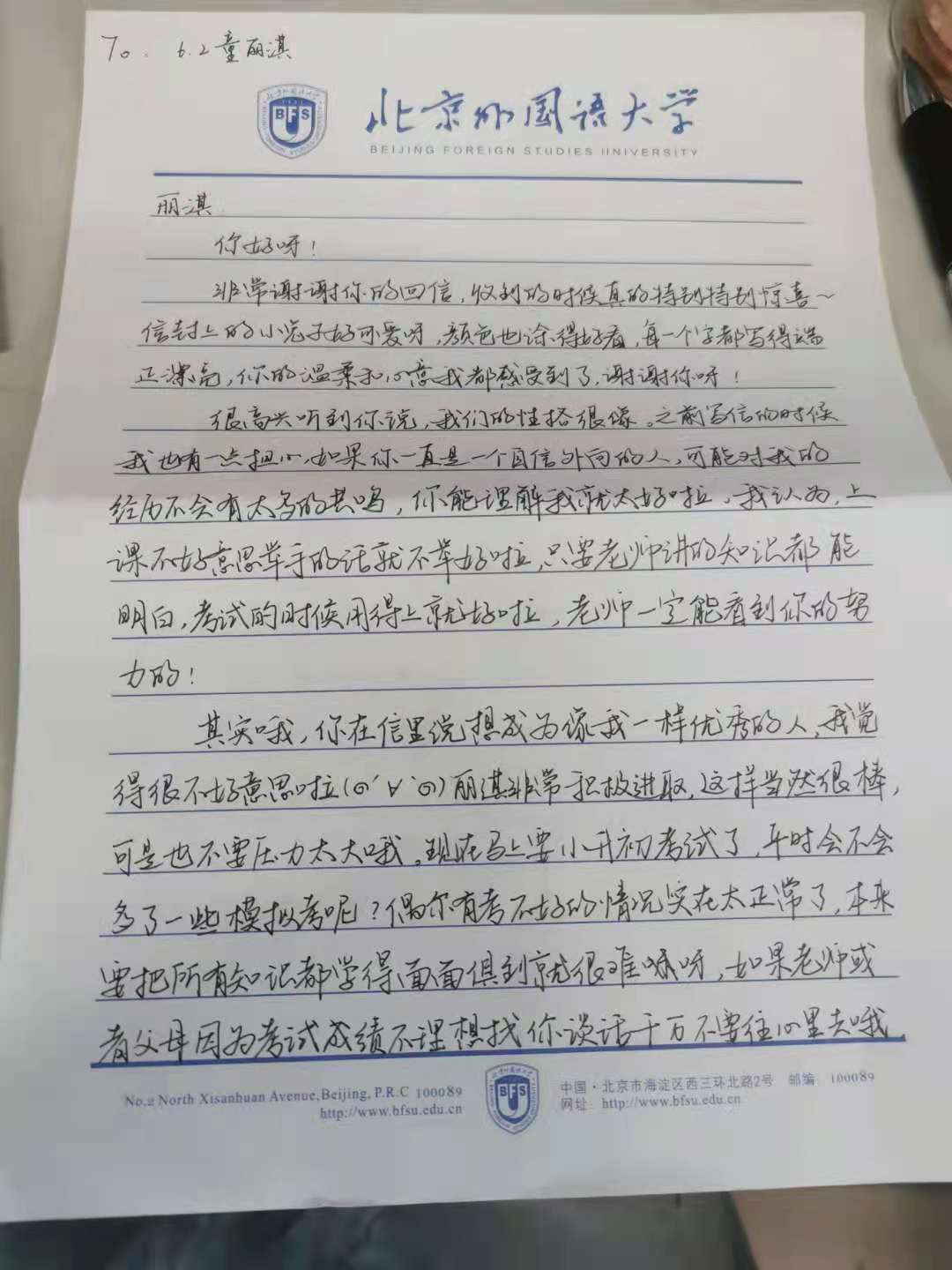 yl23411永利本科生低年级党支部积极分子何蓉同志表示,自己非常开心能通过这次的活动认识可爱的丽淇小朋友。收到回信的时候真的很感动,因为没有想到一个六年级的孩子可以写出这样满满都是真诚的信,甚至还自己画了可爱的小信封,还能看到橡皮擦的痕迹,可以想象花了多少心思。希望丽淇小朋友可以快乐地长大,做最好的自己。