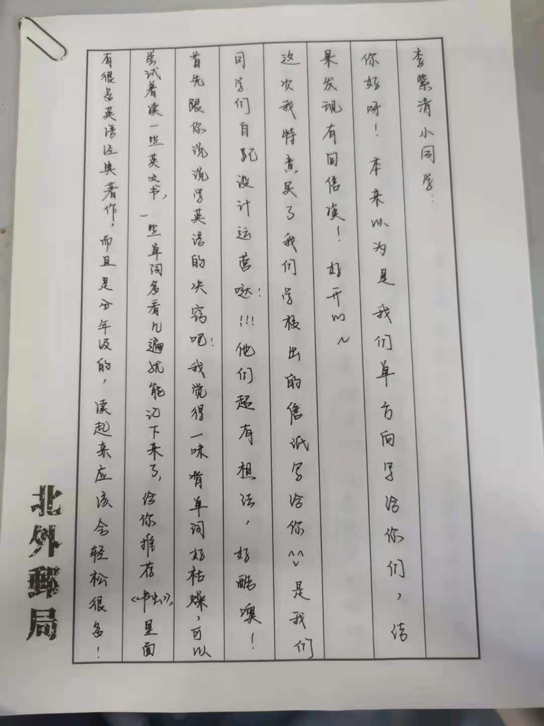 yl23411永利本科生低年级党支部党员于靖懿同志表示,两次给小朋友写信的活动我都有参与,感触颇深。这是第一次试图以一个大姐姐的口吻和小朋友交流。在写第一封信、选第一本书的时候,我特意上网寻找了五六年级的女孩会喜欢的话题,努力回想自己在这个年龄时的心态,对这两位女孩写下了真诚的问候和建议。当看到回信里对我的祝福的时候,我特别感动。我们虽然身隔几千公里,但因为这些纸上的文字而联系到了一起,一笔一墨能看到最真挚的感情。很感谢党支部的这次活动,让我和素未谋面的女孩有了联络,建立了深厚的友谊。