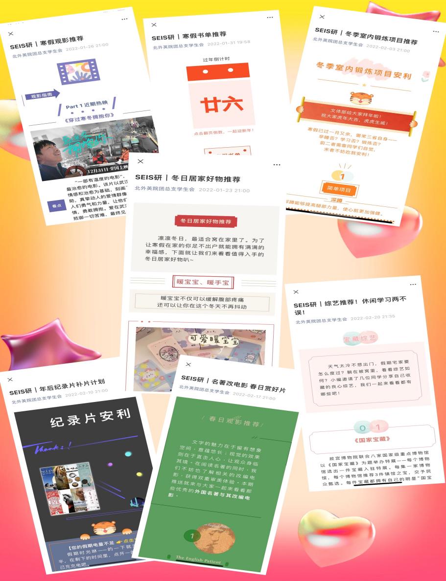 寒假期间,yl23411永利研究生团总支为同学们提供了一系列好物推荐:从《国家宝藏》、《主持人大赛》等经典纪录片到《安娜·卡列尼娜》、《卖花女》等名著改编电影;从《历史那些事儿》等纪录片到《雄狮少年》等大热电影,为同学们推荐了一系列寓教于乐的影视作品。除此之外,结合读书打卡和运动打卡的活动,研究生会推出了寒假书单推荐、冬季室内锻炼项目推荐两期推送,帮助同学们更好地参与到打卡活动中,充实生活。此外还有暖心的冬日居家好物推荐、居家指南等,让无论是留校还是返乡的同学们都能够安心、健康、舒适地度过假期。