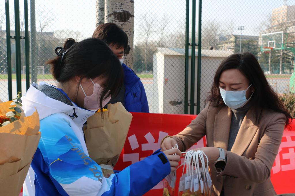 党总支书记王明欣代表公司向同学们表达了感谢。她说,冬奥会的圆满举办有着你们一份功劳,你们用自己的辛勤付出与扎实的专业技能彰显了时代青年的本色,树立了北外英院人的靓丽形象,公司以你们为荣以你们为傲。她嘱咐同学们返校后先好好休息,尽快调整状态投入学习。她还为三位同学送去了春日的祝福。一捧艳丽的手捧花、一只冰蓝色的吉祥鸟,衬着春日的和煦阳光,为同学们一冬的辛勤付出带去缕缕温暖。