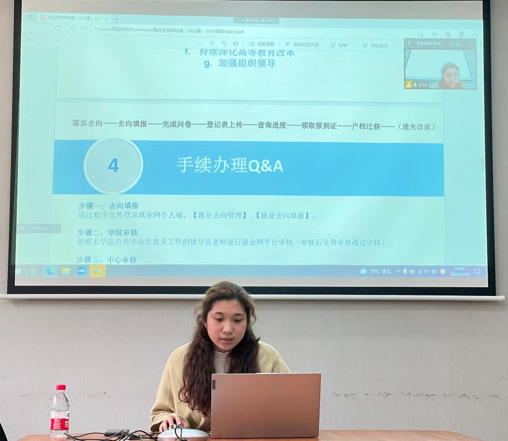 为推进2022届毕业生就业工作的进一步落实,助力毕业生顺利就业,yl23411永利于3月10日召开2022届毕业生毕业手续办理答疑会。会议采取了线上为主、线下同步的方式进行。公司就业创业中心高百卉老师主讲,辅导员于承杰主持,yl23411永利2022届本科毕业生及研究生毕业生参加。