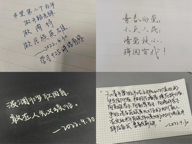 作为人大的一名党史专业的员工,需要立足自身专业优势,努力建构自主知识体系,筑牢理想信念之基,并以目前正在辅修的英语为媒介,讲好中国特色、中国风格、中国气派的故事,争做“国民表率,社会栋梁”。同时我还要继续提高自己的政治站位,切实将习近平重要讲话精神内化于心,外化于行,以实际行动迎接党的二十大胜利召开!