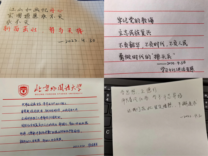 作为“国传班”的一员,我们承担着“点亮一盏灯,照亮一大片”的职责,带动身边的北外同学一起为中华民族伟大复兴添砖加瓦,这是我们的光荣使命。我们要不断提升理论素养,当好“宣讲员”,把党的理念正确、及时传达到身边同学心中。作为中国青年群体的代表,应该坚信“真理越辩越明”,要敢于和错误言论作斗争,增强理论素养,苦练内功心法,把党的故事讲好、讲深、讲透,让新时代的奋斗精神入脑入心。我们要始终牢记习近平总书记对当代青年的殷殷嘱托,立志民族复兴,在青春的赛道上奋力奔跑,做社会主义核心价值观的坚定信仰者、积极传播者、模范践行者,向英雄学习、向前辈学习、向榜样学习,争做堪当民族复兴重任的时代新人,在实现中华民族伟大复兴的时代洪流中踔厉奋发、勇毅前进。