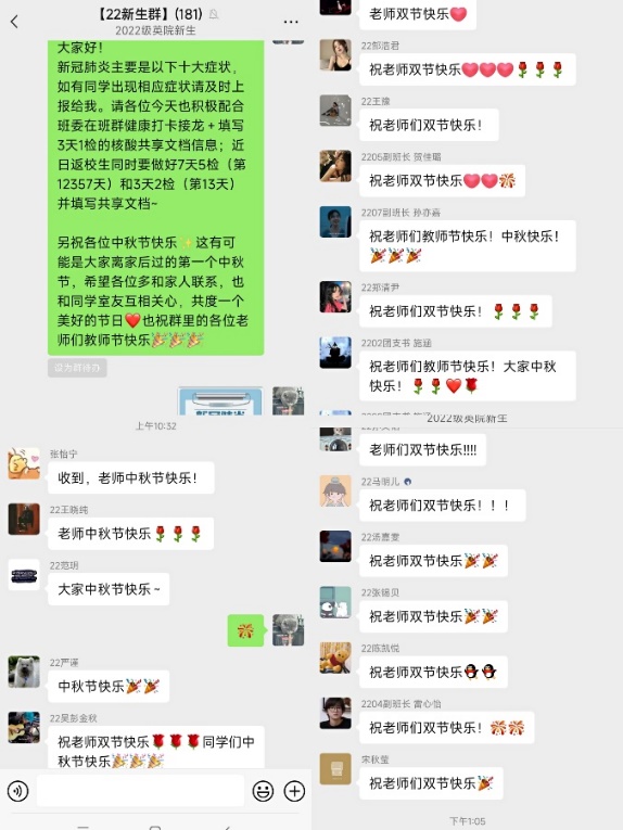 辅导员老师们也在各自分管的年级群为同学们送上中秋祝福,并为在健康观测点的员工送去中秋月饼。党总支副书记孟庆琨召开年级班委线上会议,与员工们沟通交流并送上节日祝福。