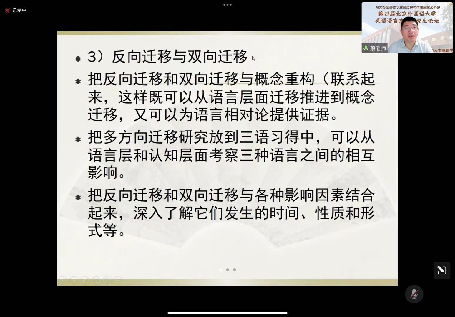 上海财经大学蔡金亭教授对“语言迁移”概念的定义和发展历程作了详细的介绍,并结合案例,分析语言迁移如何在二语乃至三语中发挥作用,并结合我国的语言现状,讨论了可以研究的具体课题以及应该采取的基本思路和方法。在讲座结束后,蔡教授还和现场同学进行了现场互动,根据同学们的提问有针对性地答疑解惑,现场气氛融洽。
