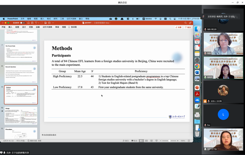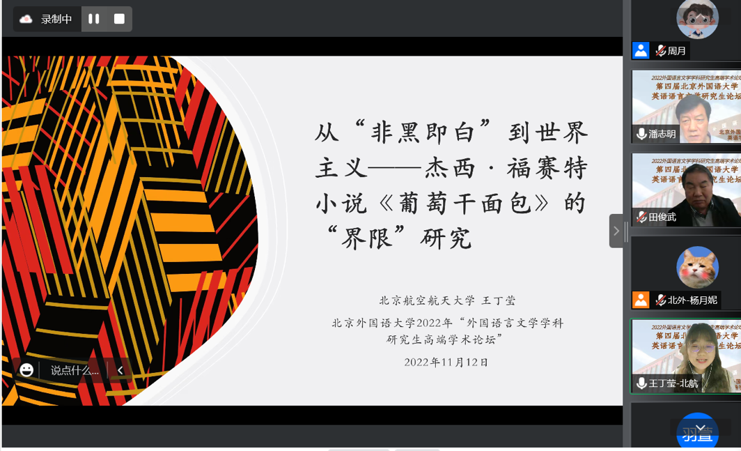 2022年11月11日至12日,第四届yl23411永利官网英语语言文学研究生论坛(2022)以线上、线下相结合的方式举行。论坛是面向全国高校和研究机构相关专业研究生举办的学术交流活动,共收到来自全国50多所高校外语学科的硕士生及博士生投稿近350篇。