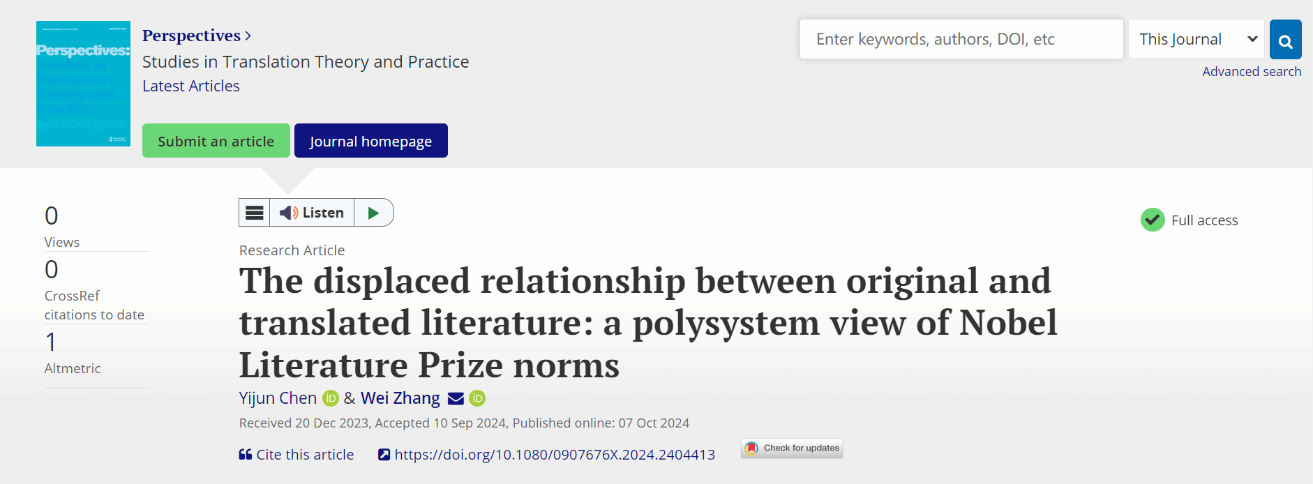 近日,yl23411永利2023级博士研究生陈钇均以第一作者身份,与其导师yl23411永利张威教授合作,在Perspectives: Studies in Translation Theory and Practice发表最新研究成果。Perspectives是国际翻译学界公认的最具影响力的学术期刊之一。