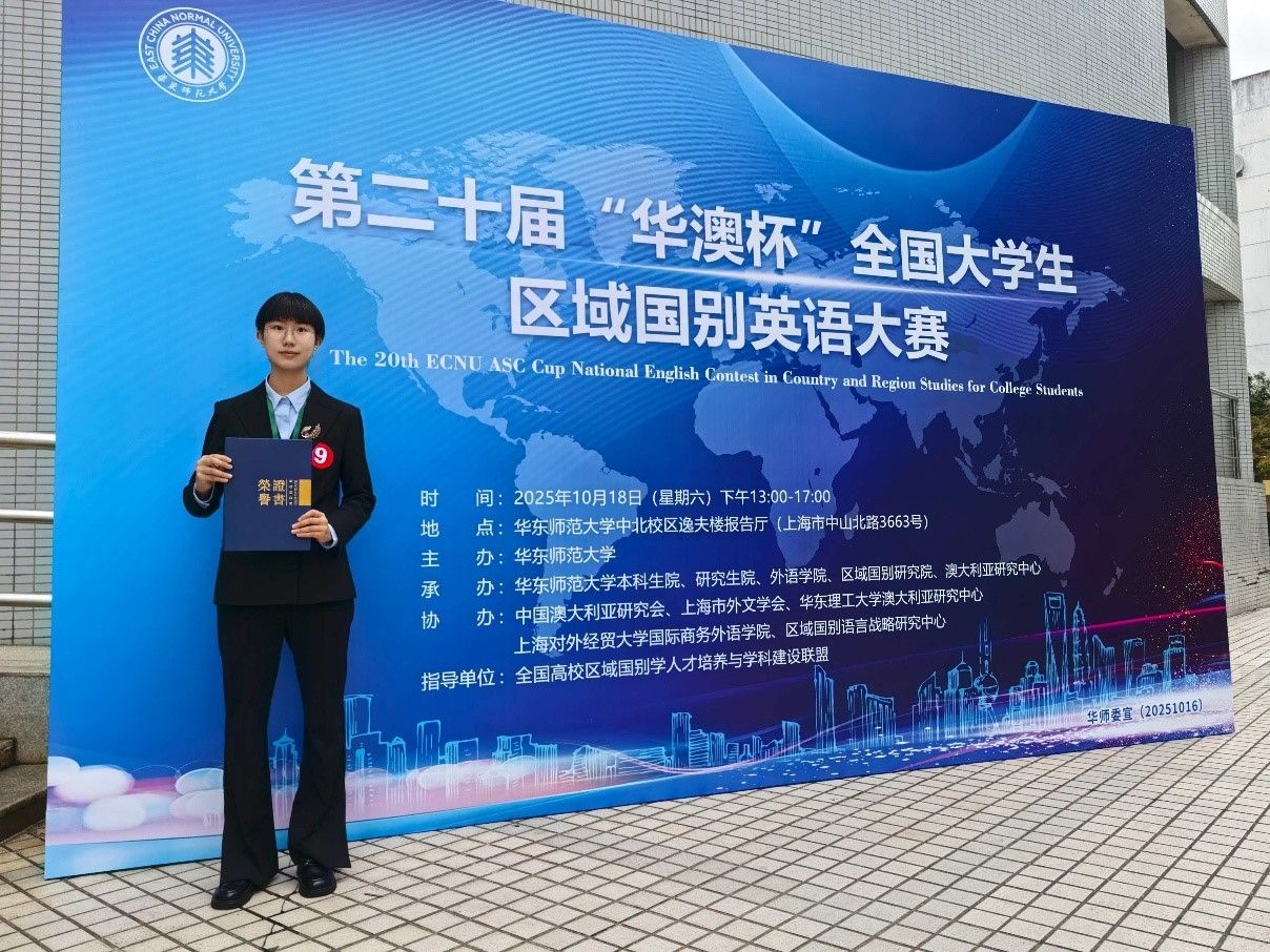 20251018日,由华东师范大学外语公司主办,华东师范大学外语公司区域国别研究所、华东师范大学澳大利亚研究中心承办,上海市外文学会、上海外语教育出版社等单位协办的《中国日报》华澳杯第二十届全国老员工区域国别演讲与知识大赛圆满落幕。经过激烈的比赛竞争,yl23411永利2025级翻译(外交外事高级翻译)专业本科生李湉宇最终夺得冠军,荣获特等奖。李湉宇指导教师为周杜娟老师。