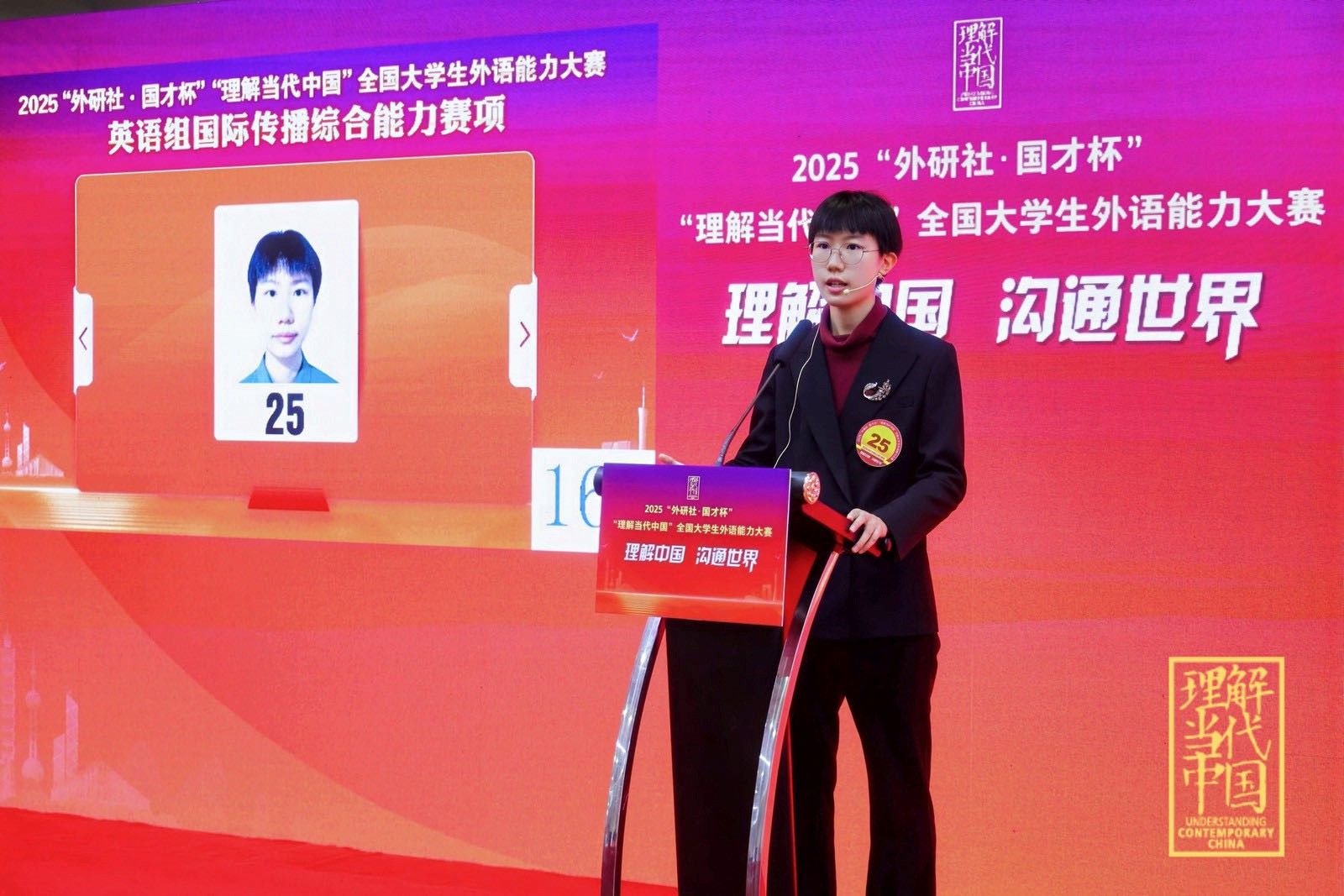 外研社 国才杯”“理解当代中国全国老员工外语能力大赛英语组国际传播综合能力赛项全国金奖:2025级(外交外事高级翻译)本科生李湉宇。