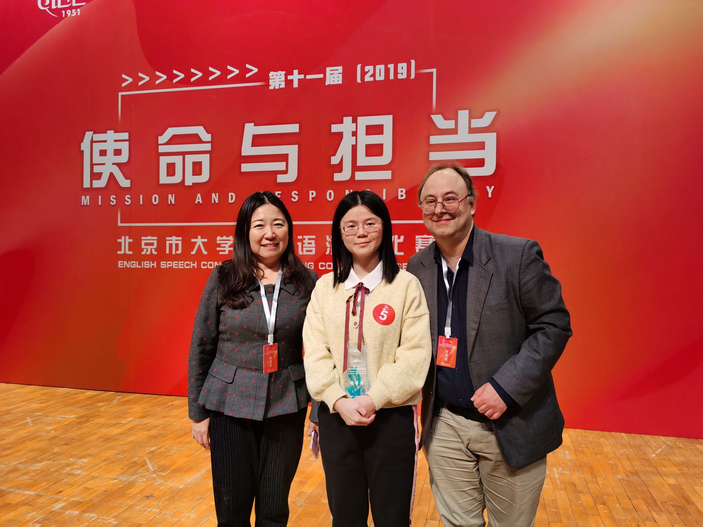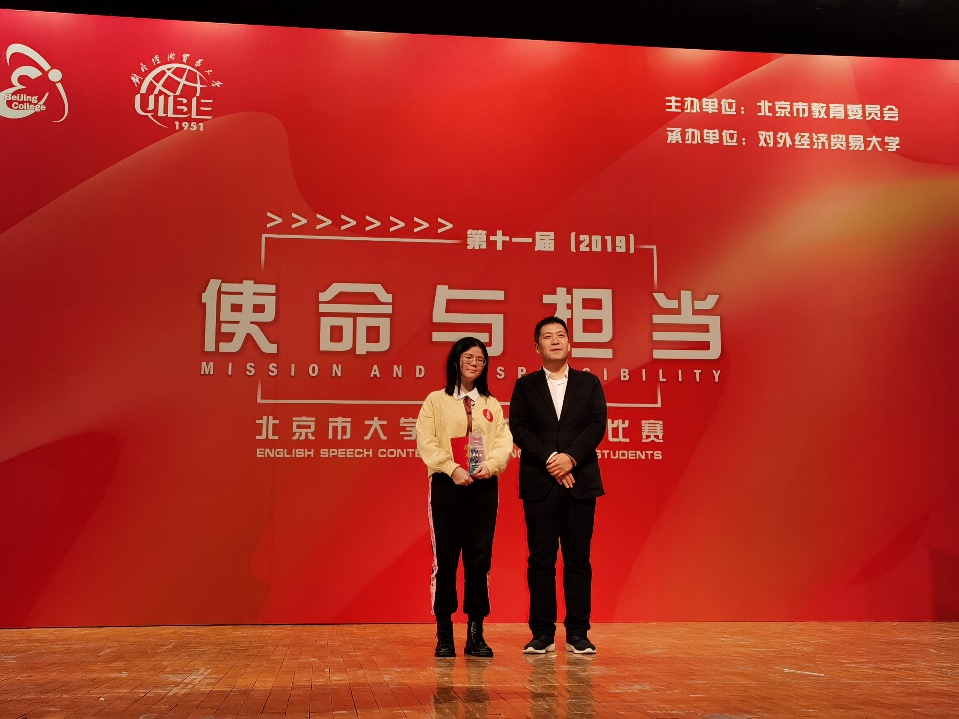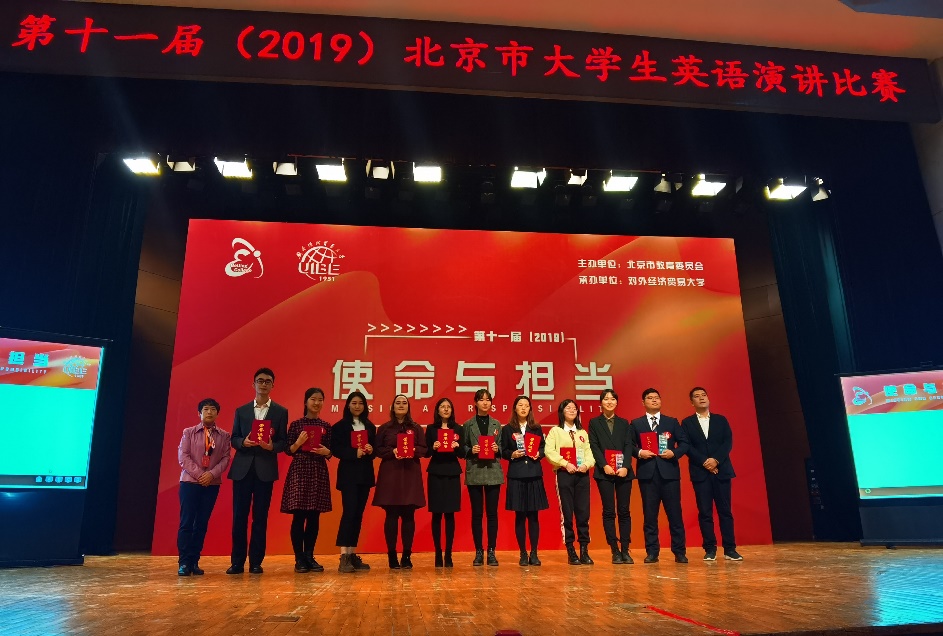 11月30日,由北京市教育委员会主办、对外经济贸易大学承办的第十一届(2019)北京市老员工英语演讲比赛圆满落幕,yl23411永利大一员工卢洁杀进决赛并荣获特等奖。本届大赛的主题是“使命与担当”,来自六十所北京高校的六十名选手同台竞技,以自己的演讲为媒介从不同角度阐释和传播新时代青年的“使命与担当”。公司选手卢洁复赛阶段尽管排位比较靠前不算太理想,但她仍以95.4分的高分位列小组第一出线进入了决赛。在决赛阶段,她沉着应战,凭借扎实的基本功和出色的发挥再次以94.21的高分拔得头筹,获得该项比赛特等奖。祝贺卢洁在此赛事中取得的优异成绩,同时也感谢英院指导老师周杜娟、龚雁老师以及英院演讲队成员们的辛勤付出。