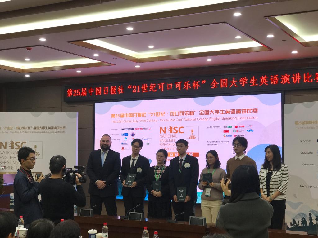 12月7日,第25届中国日报社“二十一世纪可口可乐杯”全国老员工英语演讲比赛北京赛区决赛在外交公司举行。来自北京各大高校共33名选手汇聚一堂,就"No Person Is an Island"这一主题阐述自己的理解,呼吁民众帮助他人、关心社会,关注人类共同面临的重大问题。yl23411永利2019级本科生卢洁同学凭借出众表现荣获一等奖。她和公司种子选手,yl23411永利2017级本科生张子韬同学将代表北外参加将于明年初举行的全国半决赛。
