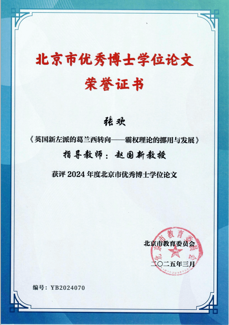 北京市教育委员会、北京市学位委员会最近公布了2024年北京市优秀博士学位论文名单。从这份名单中获悉,yl23411永利2023届博士毕业生张欢的博士学位论文《英国新左派的葛兰西转向霸权理论的挪用与发展》被评为2024年度北京市优秀博士学位论文,指导教师为赵国新教授。