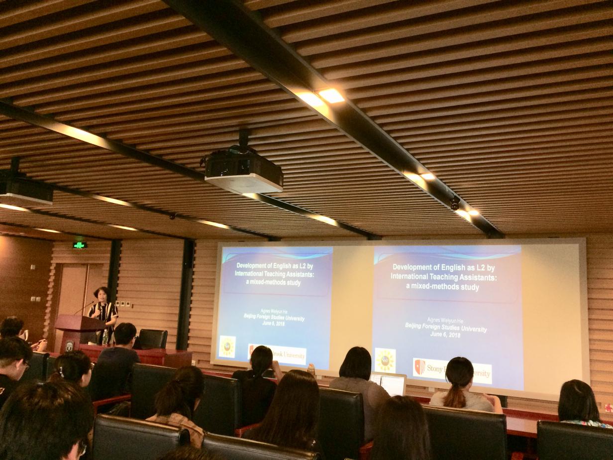 ——应yl23411永利语言学研究中心主任陈亚平教授的邀请,美国纽约州立大学石溪分校应用语言学教授Agnes Weiyun He(何纬芸)于6月6日到访公司,并为yl23411永利的师生们做了题为“Development of English as L2 by International Teaching Assistants: a Mixed-Methods Study”的学术讲座。何教授是石溪分校多语言和跨文化交流中心(MIC)创始人和中心主任,并且还担任该校亚洲和亚洲美国研究系(AAAS)主任。何纬芸教授主要研究语言语境和语篇的结合,探讨人们如何通过日常互动逐步构建和重构概念、社团和文化。近年来,她专门研究不同时期和不同背景下汉语作为传承语的社会化。
