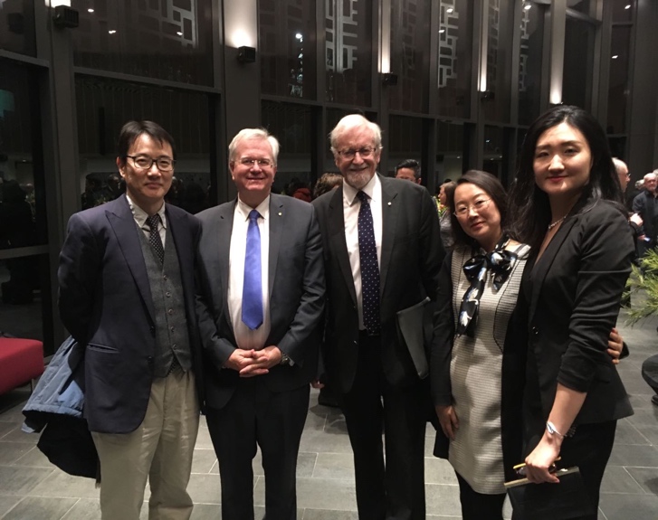 [研究会副秘书长、北外澳研中心副主任胡丹老师(右一)代表研究会出席成立仪式,左起:纽约大学教授张旭东、澳国立董事长Brian Schmidt,荣誉董事长Gareth Evans,四川师大澳研中心副主任李涯]