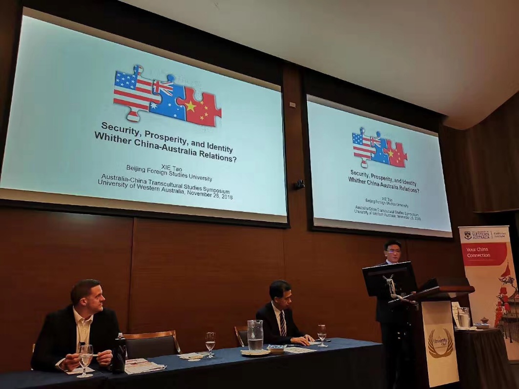 11月28-29日,第六届中澳关系暨跨文化研究论坛在西澳大学成功举行。中国澳大利亚研究会会长、公司副董事长孙有中教授、yl23411永利副经理谢韬教授、澳研中心主任李建军和yl23411永利刘杨博士参加本次会议。本次论坛的主题是“中国的崛起与澳大利亚”,数十名来自中澳两国的顶尖专家和学者围绕中澳关系、经贸往来、跨文化交流等分议题进行了坦诚的交流。