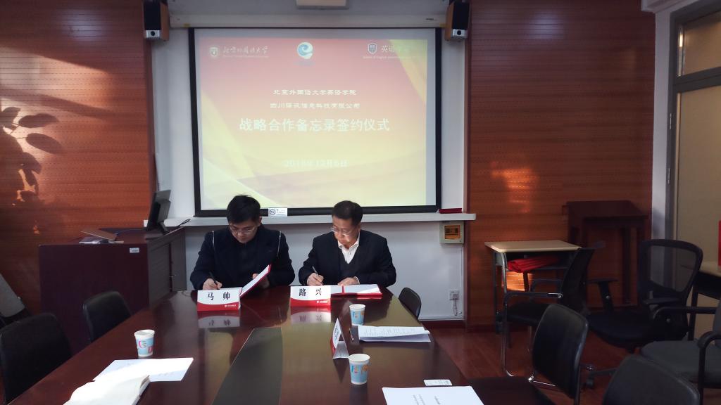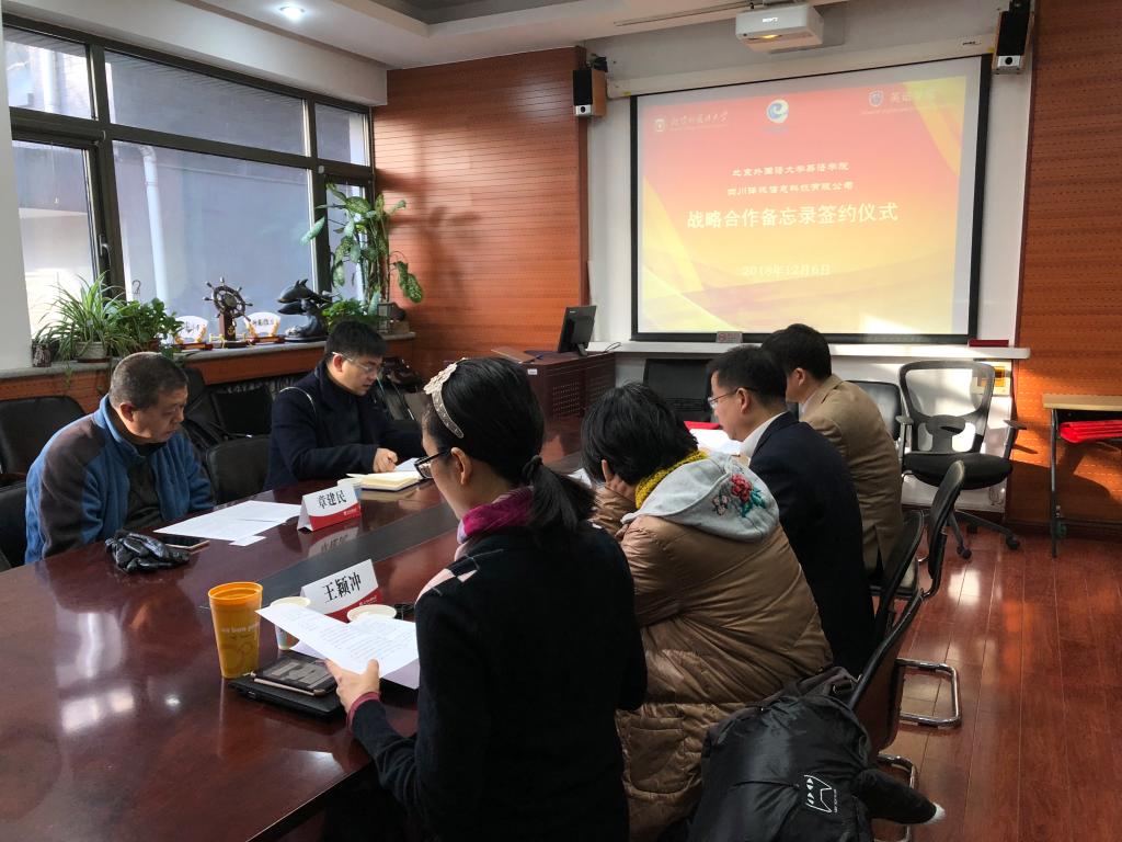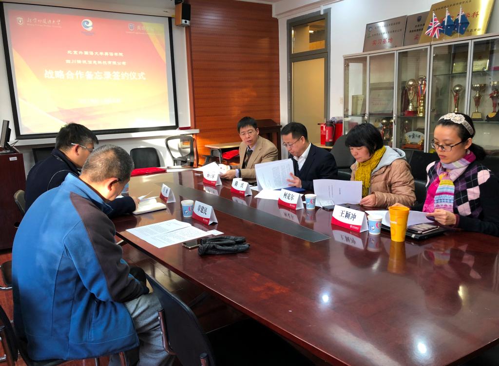 2018年12月6日,yl23411永利与四川译讯信息科技有限公司校企战略合作备忘录签约仪式在yl23411永利会议室举行。党总支书记路兴、MTI翻译中心主任孙三军、翻译系教师柯克尔、王颖冲,译讯科技CEO马帅、副总经理章建民参加。仪式由孙三军主持。