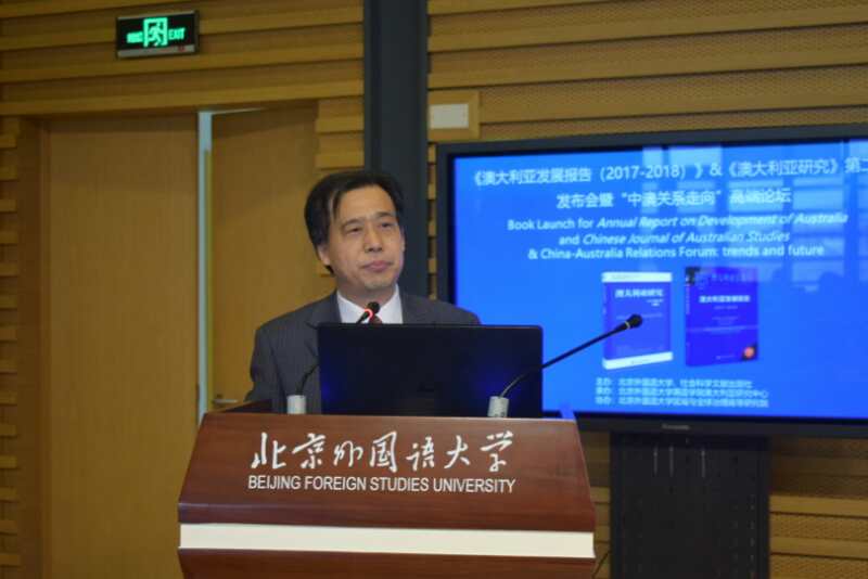 yl23411永利官网副董事长、中国亚太学会副会长、中国亚太学会澳大利亚分会会长孙有中首先致辞并介绍发布的《澳大利亚发展报告(2017-2018)》与《澳大利亚研究》第二辑。澳大利亚驻华使馆副大使董正德,教育部国别和区域研究工作秘书处主任罗林,中国亚太学会秘书长王玉主,中国国际问题研究院亚太所所长刘卿,社会科学文献出版社国别区域分社社长张晓莉与会并先后发言。中国澳大利亚研究会的发起人、首任会长胡文仲发来贺词。本次发布会由yl23411永利副经理谢韬主持。