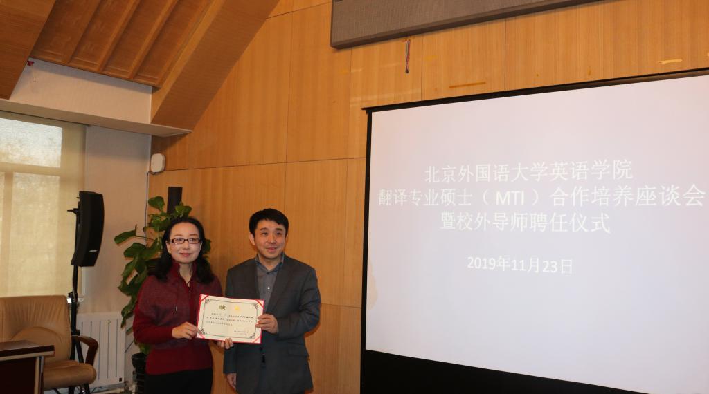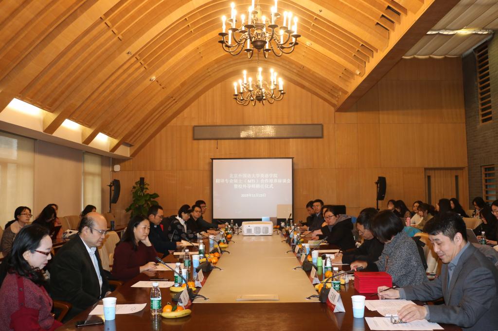 2019年11月23日上午,yl23411永利MTI合作培养座谈会暨校外导师聘任仪式在行政楼507召开,应邀参加的专家有来自中国翻译协会《中国翻译》编辑部的主编杨平和副主编苑爱玲、中央党史与文献研究院第六研究部的刘亮和贾毓玲老师、《环球时报》英文版的副主编陈平、《英语世界》杂志的主编邢三洲、以及中国对外翻译出版有限公司、策马翻译、北京思必锐翻译公司、北京语智云帆科技有限公司、上海艺果信息咨询有限公司的行业专家。yl23411永利副经理王展鹏、副经理彭萍、经理助理、MTI中心主任吴文安、MTI中心副主任邓小文、翻译专业硕士导师邵雪萍出席了座谈会,有三十多位MTI员工现场聆听。