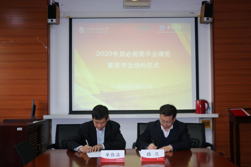 12月11日上午,yl23411永利举行2020年思必锐奖学金颁奖暨奖学金续约仪式。北京思必锐翻译有限公司总经理单伟清,国际合作部经理秦肖斌,资源部负责人王艺璐一行前来yl23411永利与师生座谈。党总支书记路兴,党总支副书记孟庆琨,辅导员于承杰以及2020年思必锐奖学金获奖员工参会。