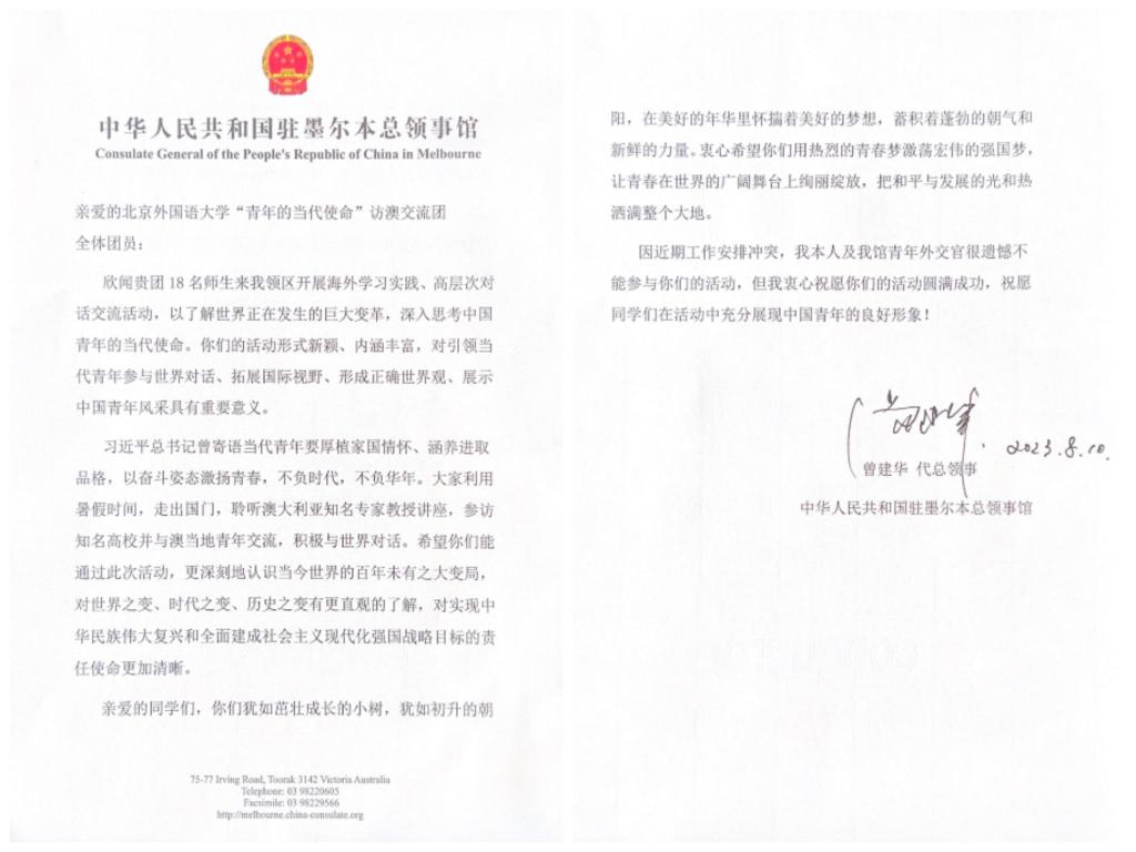 中国驻墨尔本总领事馆为公司海外实践团发来寄语