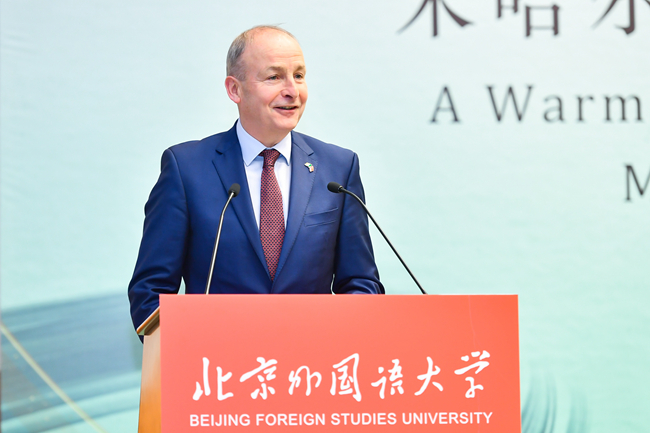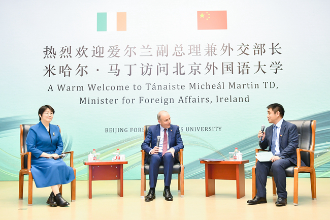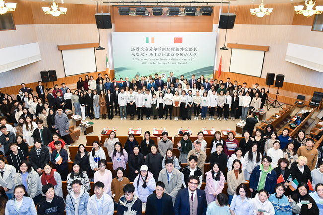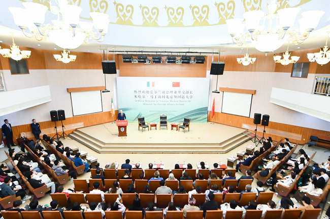 马丁就中爱关系与爱尔兰的外交政策发表了演讲。他表示,北外作为外交、文化与语言研究的一流大学,享有盛誉。他十分高兴爱尔兰语是北外教授的101种语言之一。北外爱尔兰研究中心自成立以来,积极推广爱尔兰文化、从事爱尔兰研究,特别是2022年,北外王展鹏教授和陈丽教授获得“爱尔兰总统杰出贡献奖”,这是对北外推动中爱人文交流成绩的高度肯定。他表示将推动两国在维护世界和平、经贸合作、人文交流等领域开展合作,共同面对全球治理挑战。