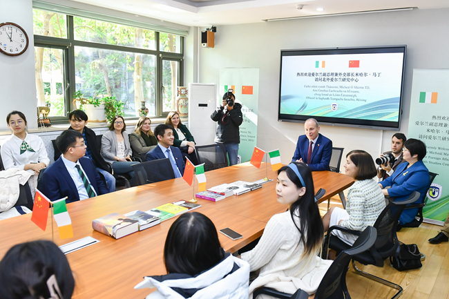 随后,马丁前往yl23411永利参观了北外爱尔兰研究中心,与爱尔兰研究中心及学习爱尔兰语课程的师生座谈交流。他对爱尔兰研究中心取得的成就表示祝贺,并指出,中爱教育合作大有可为,鼓励更多员工赴爱尔兰学习交流。
