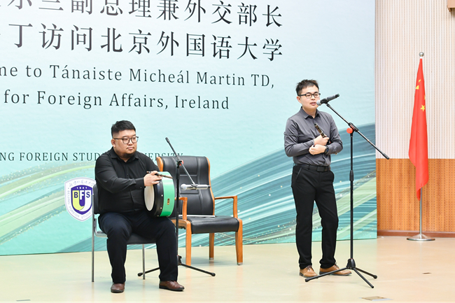 国内爱尔兰音乐爱好者用爱尔兰传统乐器为现场师生进行了音乐表演,北外爱尔兰语师生用汉语、英语、爱尔兰语三语朗诵了爱尔兰诗人叶芝的著名诗歌《当你老了》,马丁受邀上台参与爱尔兰语朗诵,现场气氛热烈。