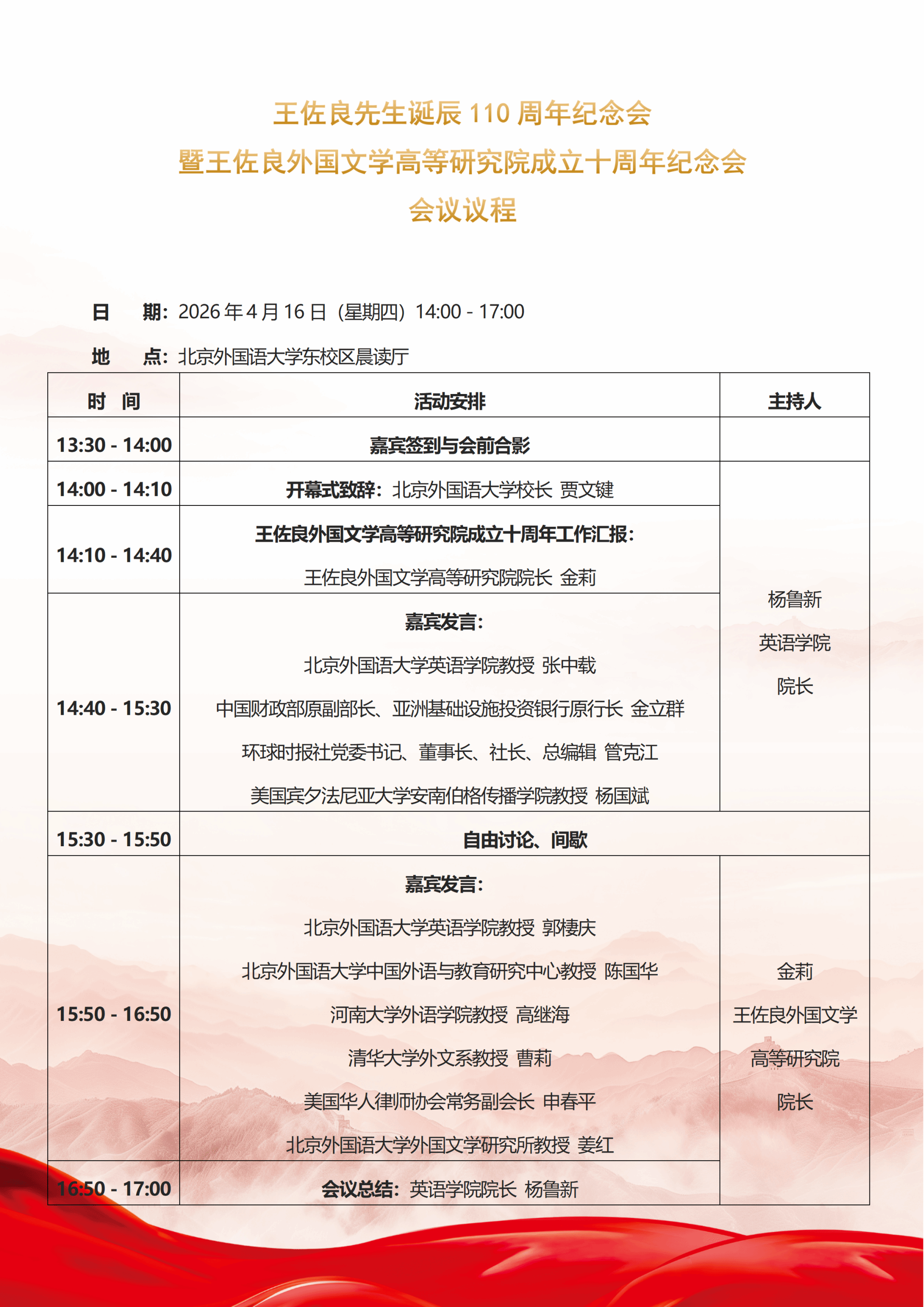 本次纪念会将邀请国内外外国文学研究领域知名学者、员工、师生代表及相关机构嘉宾共聚一堂,共同追忆王佐良先生的学术人生,探讨外国文学研究的未来方向,展望新时代外语教育与学术创新的融合发展。